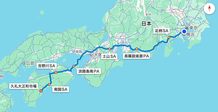 淡路島南PA でトイレ休憩を取って、そのまま鳴門大橋で四国入り。徳島道・四国横断道で四国の真ん中を突っ切り、吉野川SA と 南国SA で最後の休憩。