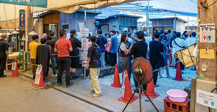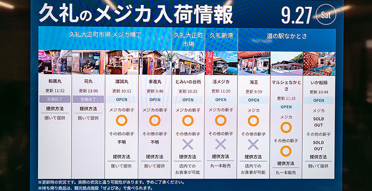 メジカは漁の状況によって提供が左右ため、Webサイト および休憩所のモニターでその日の入荷状況を確認出来るようになっている。横丁内の店は4つあり、いずれも物置サイズの小さな小屋で捌いて提供するのみで、店内で食べられるようにはなっていない。