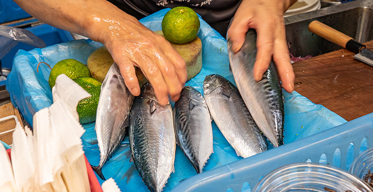 並び始めてから1時間ちょっと経って、ようやく我々の順番が回ってきた。この日提供しているのはメジカ (ソウダガツオ)・スマガツオ・ホシガツオの3種類。新子としてのサイズはほぼ同じ。いずれも食べたことが無いものなので、メジカを3尾、スマガツオを2尾、ホシガツオを1尾注文。