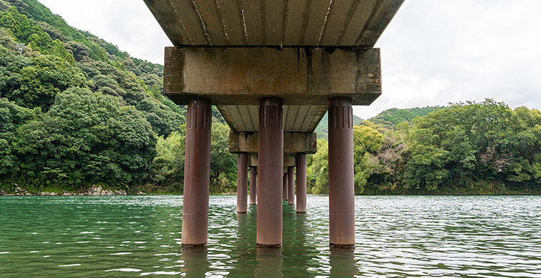 橋長171.4m、幅員4.4m。増水していなければ橋の下を潜ることが出来るけど、奥の渦は危険なので近付かないように注意。