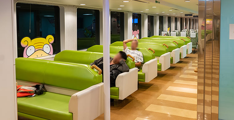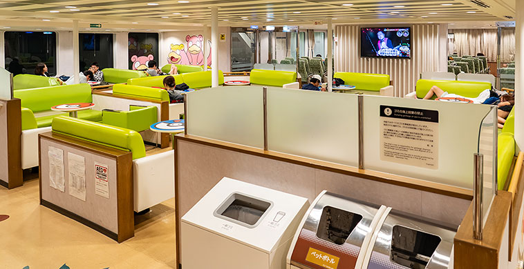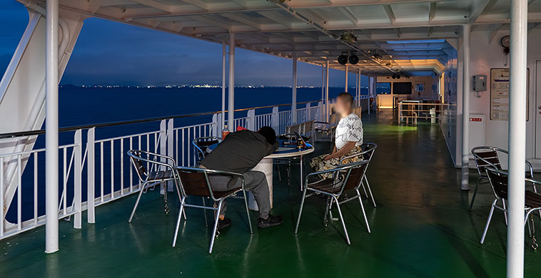 姫路までの100分をずっと外部デッキで過ごすのも疲れそうなので、日没以降は船内に入ってベンチシートでダラダラ過ごす。下船後はほぼぶっ通しで東京まで戻ることを考えると、全員でのまとまった休息はこのタイミングが最後ということになる。